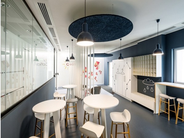 辦公室設(shè)計搭配色彩,獨特的紋理地毯、讓每一處都是滿滿的精彩,從而呈現(xiàn)出完美的空間效果。巧妙的運用不規(guī)則幾何造型,再涂刷以企業(yè)的品牌色系如:草綠、海藍、天藍和青色,讓整個空間充滿了清新活力。公司文化氛圍和環(huán)境的舒適性融入到打造了休閑以及充滿能量的協(xié)作空間。